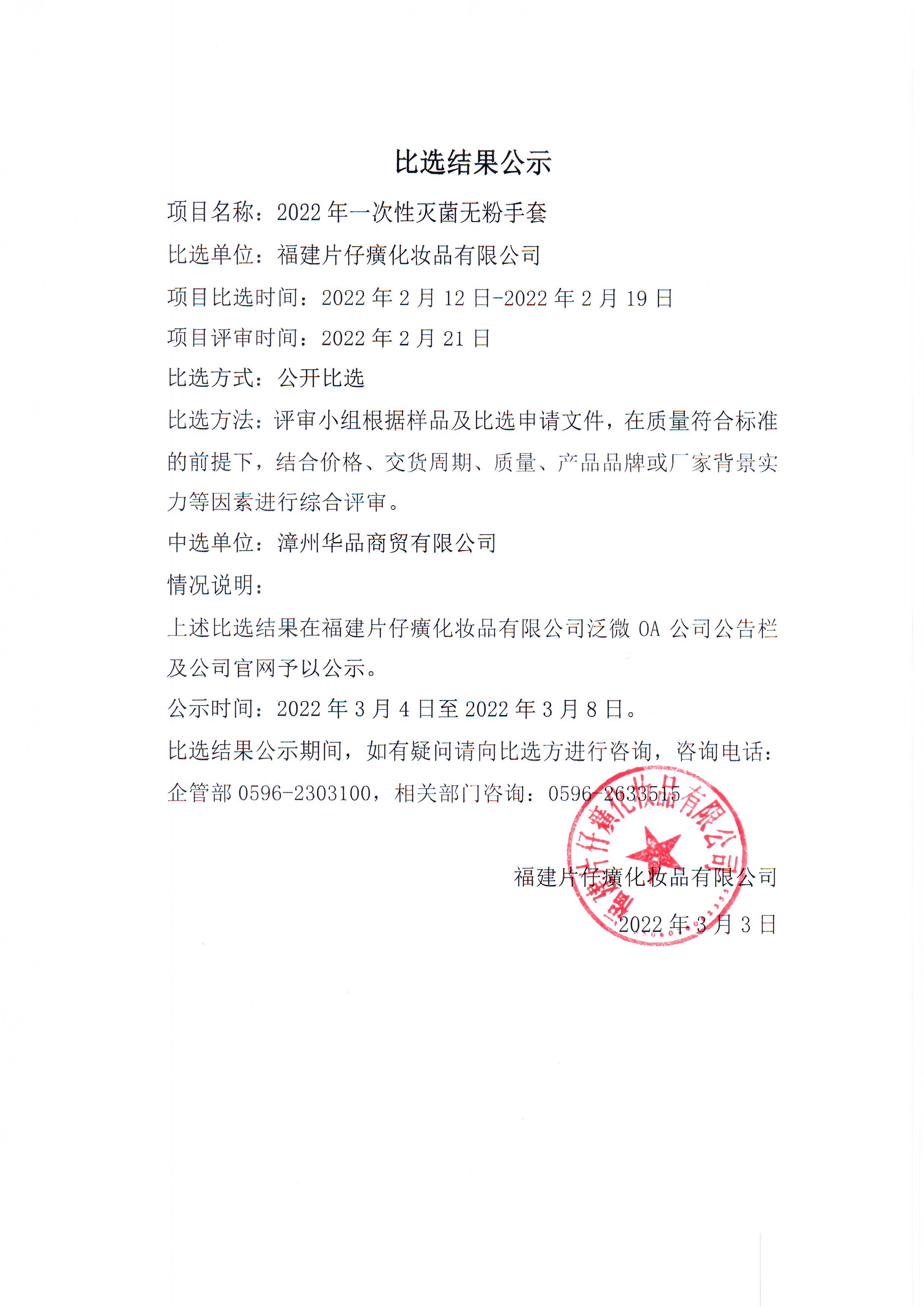 2022年一次性灭菌无粉手套公开比选结果公示