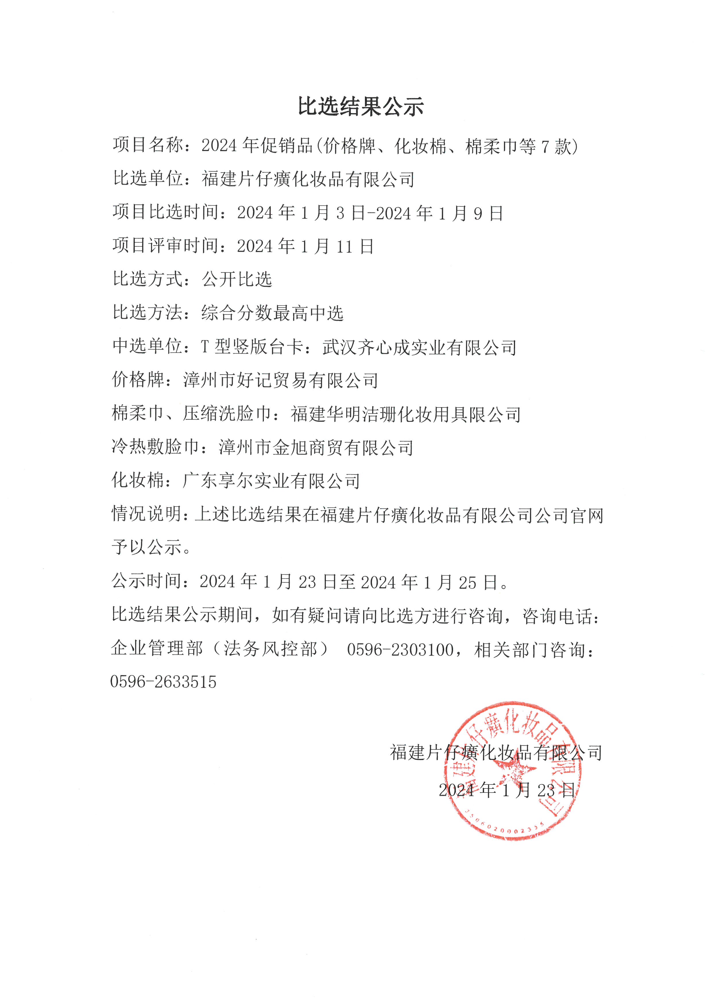 2024年度促销品(价格牌、化妆棉、棉柔巾等7款)比选结果公示