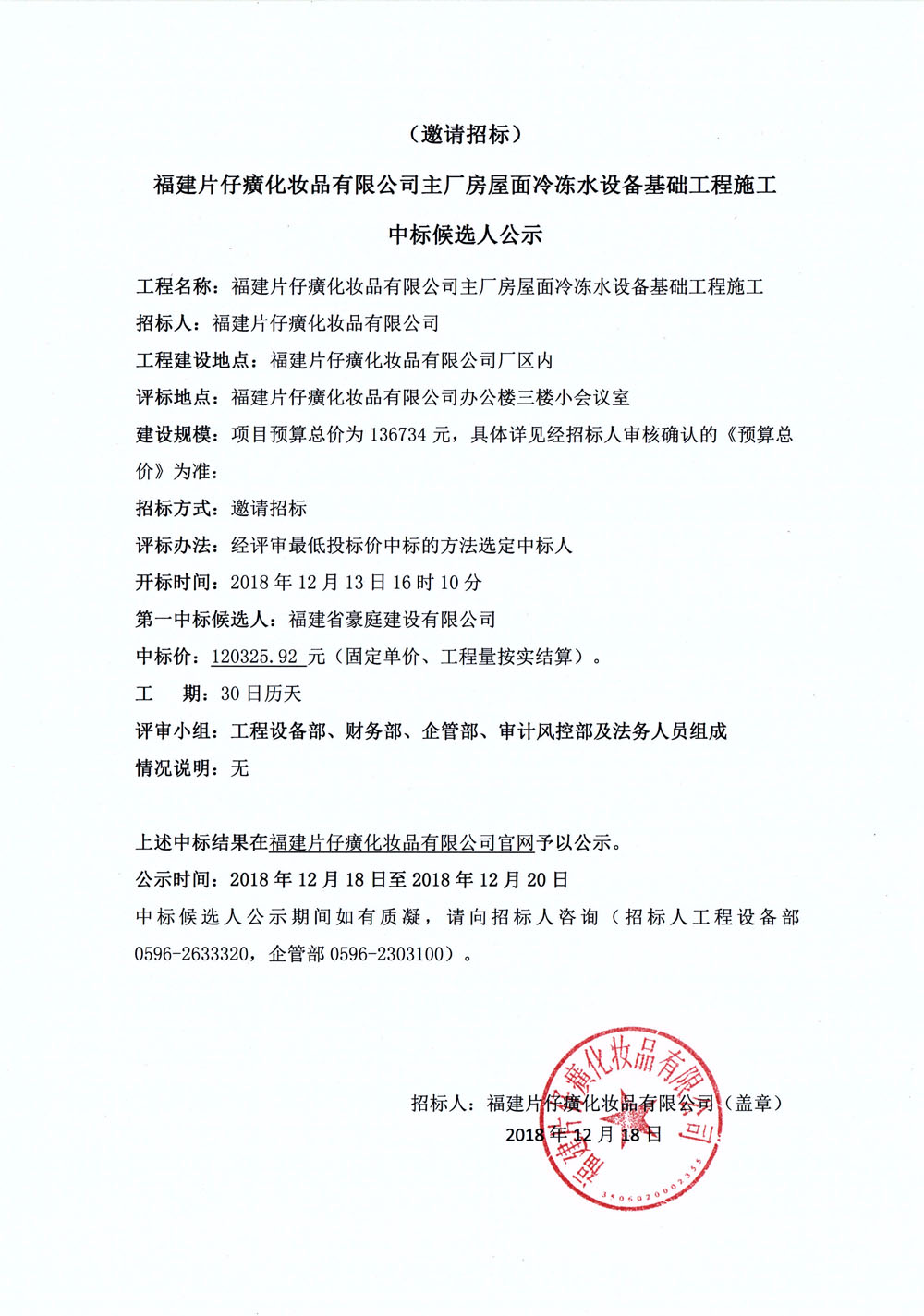 福建片仔癀化妆品有限公司主厂房屋面冷冻水设备基础工程施工中标候选人公示