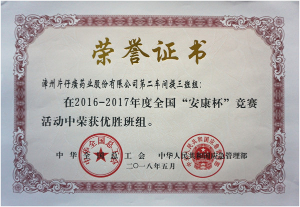 近日,全国总工会和国家应急管理部联合下发文件,表彰2016—2017年度全国“安康杯”竞赛优胜集体、优胜班组和优秀个人。片仔癀药业公司第二车间提三班组(现为饮片车间提三班组)被授予2016—2017年度全国“安康杯”竞赛优胜班组荣誉称号。参与此次“安康杯”竞赛活动的企业达62万家,参赛职工达1.2亿人,共评出795家优胜集体、779个优胜班组和245名优秀个人。