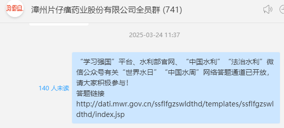 以学促行,筑牢节水根基。公司发动全员积极参与在“学习强国”学习平台开展的“世界水日”“中国水周”每日答题以及由水利部官网、“中国水利”“法治水利”等微信公众号开展的围绕节水、水资源管理等内容的网络答题活动。通过学习、答题,让职工干部掌握《节约用水条例》的内涵要义,进一步学习习近平总书记关于治水的重要论述,以知促行指导工作实践,积极践行文明健康绿色环保的生活理念。