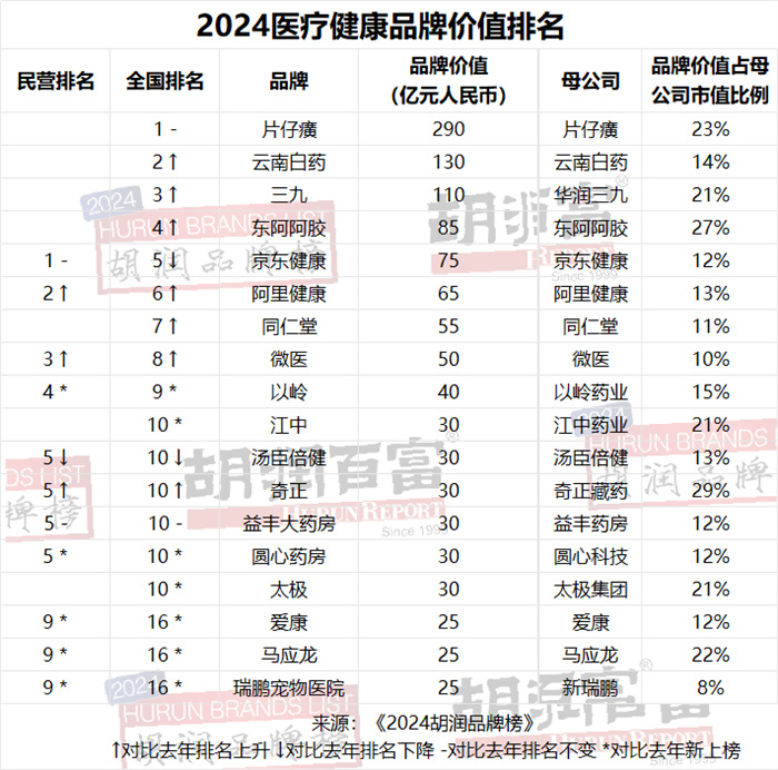 2025年4月16日,胡润研究院发布《2024胡润品牌榜》,片仔癀连续五年领跑,稳居“胡润品牌榜医疗健康品牌价值榜”榜首。