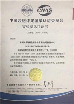 2020年12月1日,漳州片仔癀药业股份有限公司检测中心取得由中国合格评定国家认可委员会颁发的符合ISO/IEC17025:2017新版实验室认可证书,正式通过国家实验室认可复评审+变更评审,恢复我司检测中心搬迁后的国家实验室(CNAS)认可资格。是我司检测中心从2018年4月首次获得CNAS认可证书后再次取得具有里程碑意义的一次认可资格。
