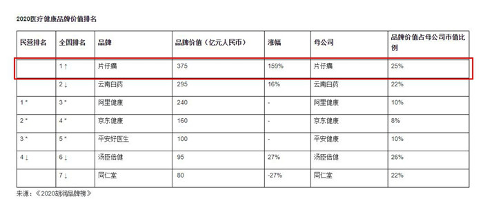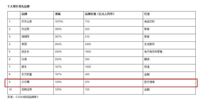 十大增长领先品牌,片仔癀以涨幅159%,品牌价值375亿元人民币成为医疗健康行业唯一入选品牌。
