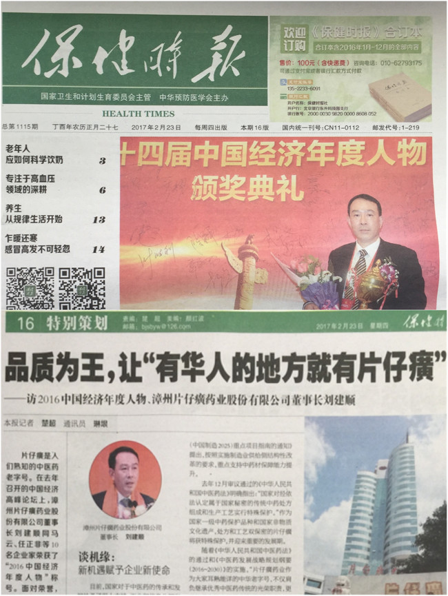 《保健时报》《访2016中国经济年度人物、漳州片仔癀药业股份有限公司董事长刘建顺——品质为王,让“有华人的地方就有片仔癀”》