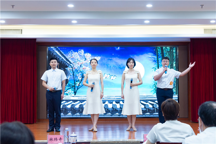 比赛现场,来自基层党支部的12个参赛作品以独诵、对诵、合诵等多样表现形式,在舞台上尽展风采。伴随着精美的视频配乐,参赛者们或慷慨激昂,或婉转低回;或深情回顾建党百年来的伟大成就,抒发浓厚的家国情怀;或结合企业的发展历程,赞颂“务实、包容、创新、发展”的片仔癀精神。他们用文字抒发理想信念,用声音传递青春力量,展现了朗诵的艺术感染力和舞台表现力,表达了片仔癀党员、干部、职工们对党矢志不渝的热爱和对二十大胜利召开的祝福。现场高潮迭起,气氛庄重而热烈,精彩的朗诵赢得了评委和现场观众的阵阵掌声。