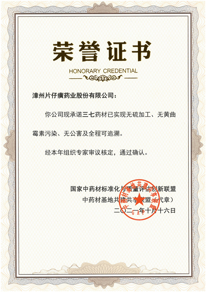 片仔癀药业为践行“选材精良、匠心精制、服务精诚、精益求精”的质量方针,十多年前便开始在三七道地产区云南省文山州开展三七药材基地共建,2017年片仔癀药业联合十家企业及科研院所建立并发布了我国第一个无公害三七标准,并率先在共建的三七药材基地严格执行,确保为片仔癀提供最优质的三七药材原料。近年来,片仔癀药业为进一步把控中药材源头质量,联合科研单位利用现代信息技术开展中药材基地全过程追溯体系搭建,实现三七药材来源可查、去向可追、质量可控。通过多年的三七药材基地建设,片仔癀药业三七基地更是荣获2021年度“三无一全”品牌基地荣誉称号,向社会承诺片仔癀药业所用三七药材达到“三无一全”的标准,即:无硫加工,无黄曲霉毒素污染,无公害(包括无农残超标、无重金属超标、无使用生长调节剂促进采收器官的生长)和全过程可追溯。