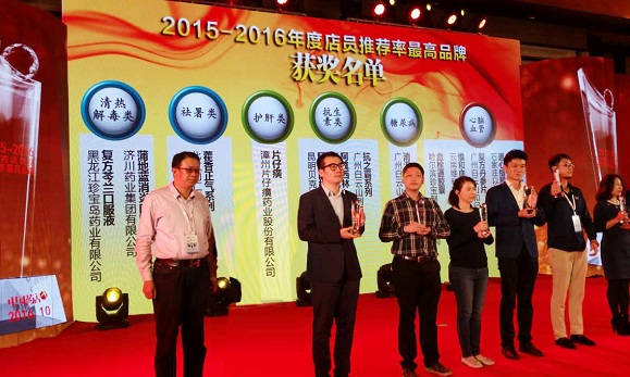 在第16届中国药典高峰论坛会议同时,“2015~2016年度中国药店·店员推荐率最高品牌”颁奖典礼,也在晚宴中盛大举行。