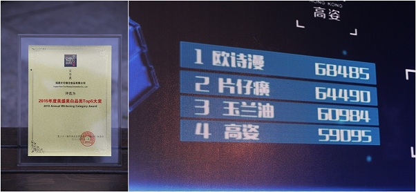 2015年11月26日,“聚变开势”——首脑精英荟·第21届中国美容博览会品牌联盟广东峰会盛大召开。作为国内祛黄领军品牌,片仔癀化妆品凭借优异的创新能力以及快速响应市场需求,在短短数日之内,在微信平台上获得了64490票数的支持,荣获“2015年度美盛美白品类大奖”第二。
