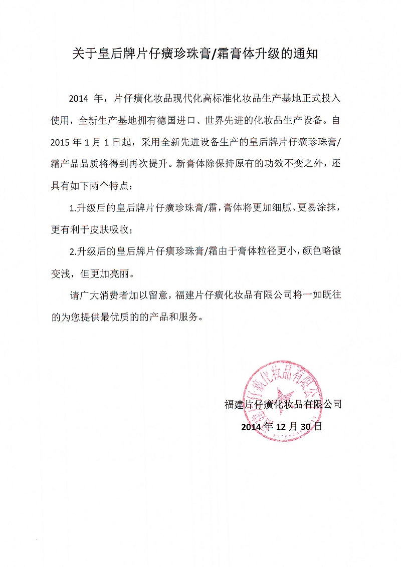 关于皇后牌片仔癀珍珠膏(霜)膏体升级的通知