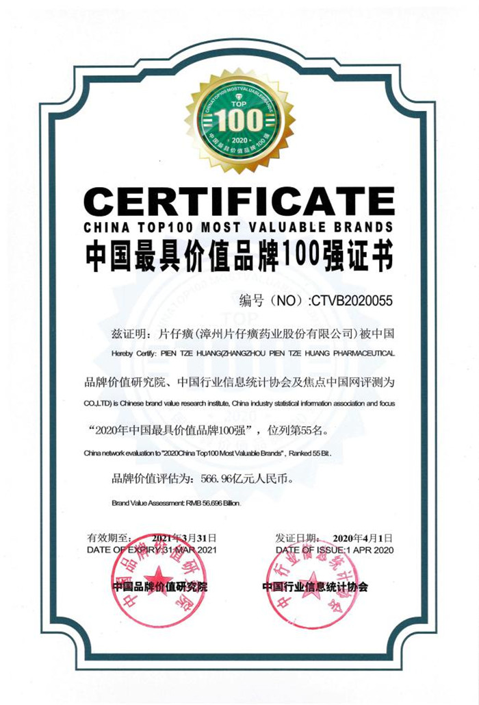 经中国品牌价值研究院等权威单位评定,片仔癀以品牌价值566.96亿元居《2020中国最具品牌价值100强》第55位,品牌价值较去年增加超百亿,排名上升4位。品牌价值逐年提升,品牌力不断增强,充分显示了社会各界对片仔癀品牌实力的高度肯定。