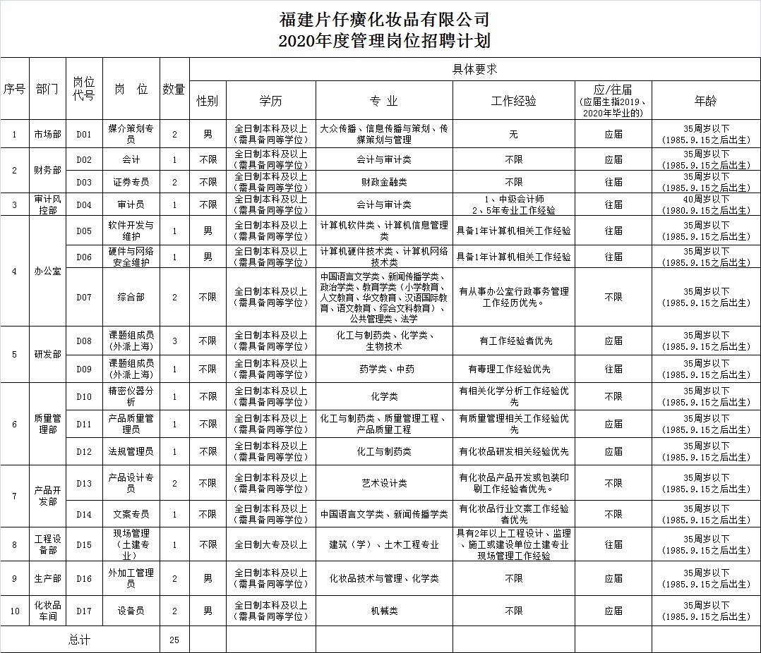 招聘岗位和具体要求详见底部附件《福建片仔癀化妆品有限公司2020年度管理岗位招聘计划表》,招聘公告在福建片仔癀化妆品有限公司官网(http://www.pzhchina.com)、中国海峡人才网(http://www.hxrc.com)发布。