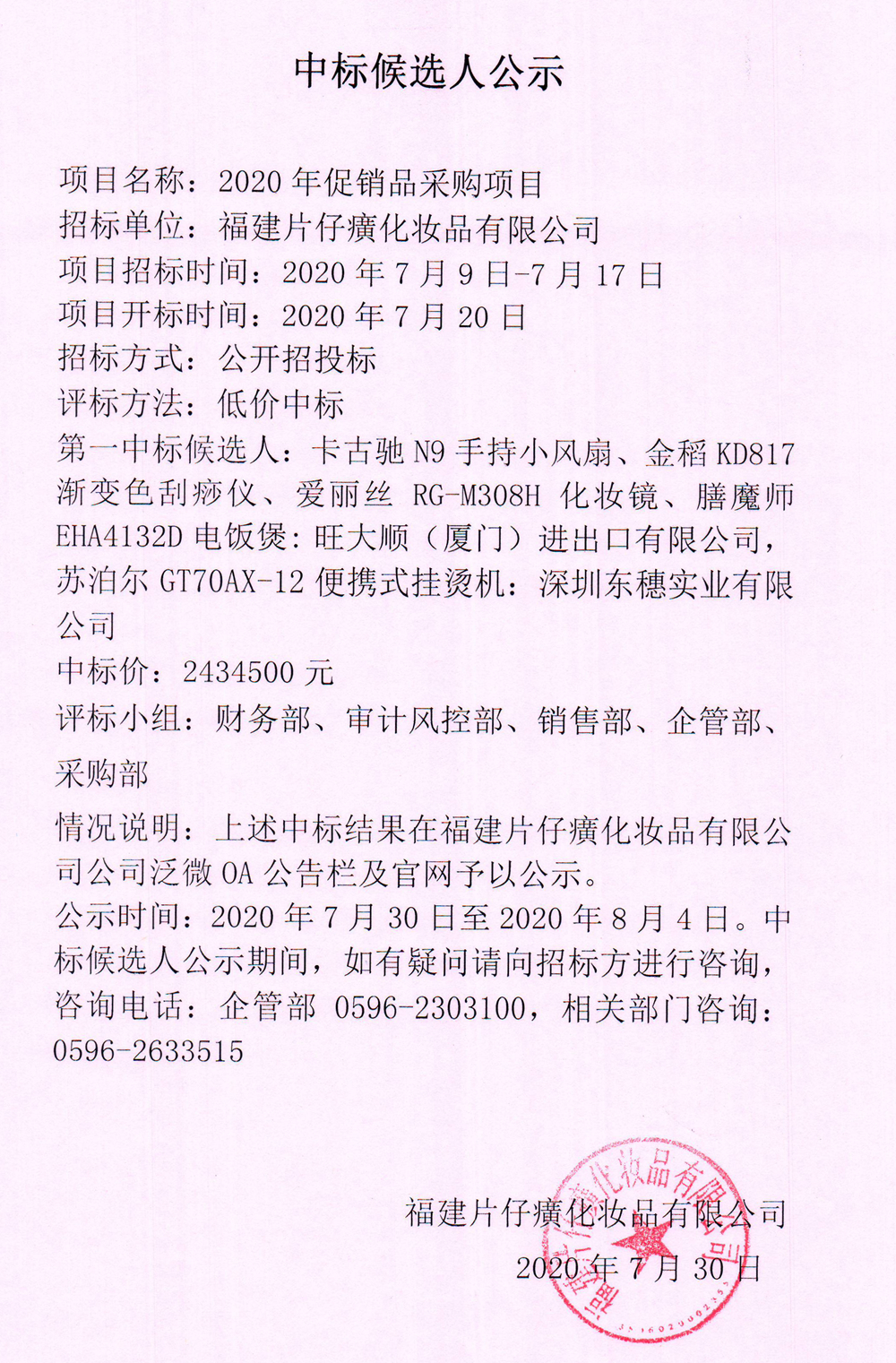 2020年促销品采购项目中标候选人公示