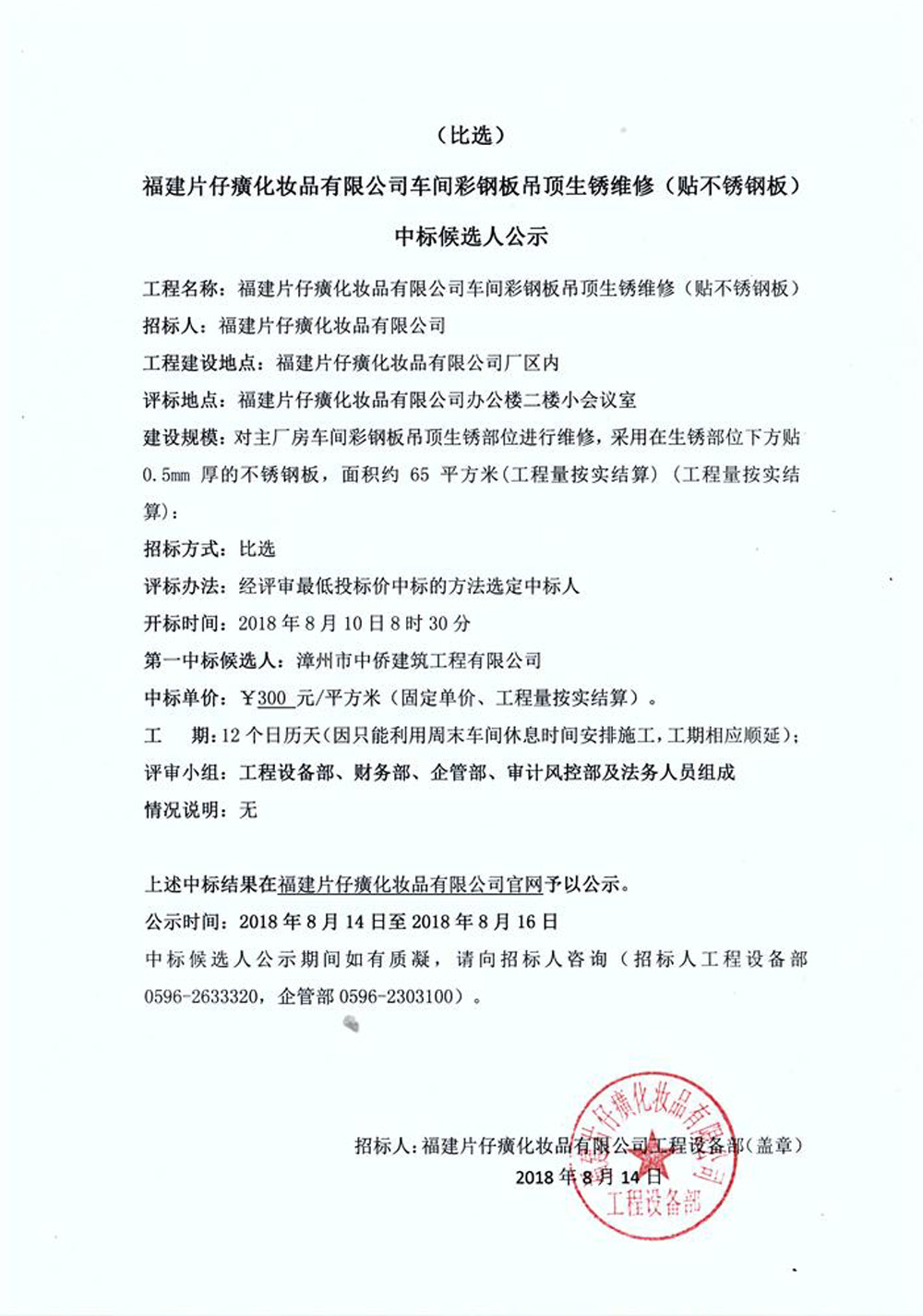 福建片仔癀化妆品有限公司车间彩钢板吊顶生锈维修(贴不锈钢板)中标候选人公示