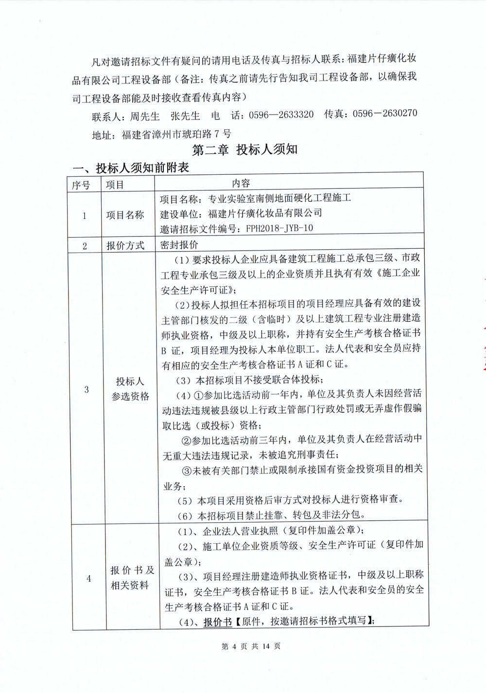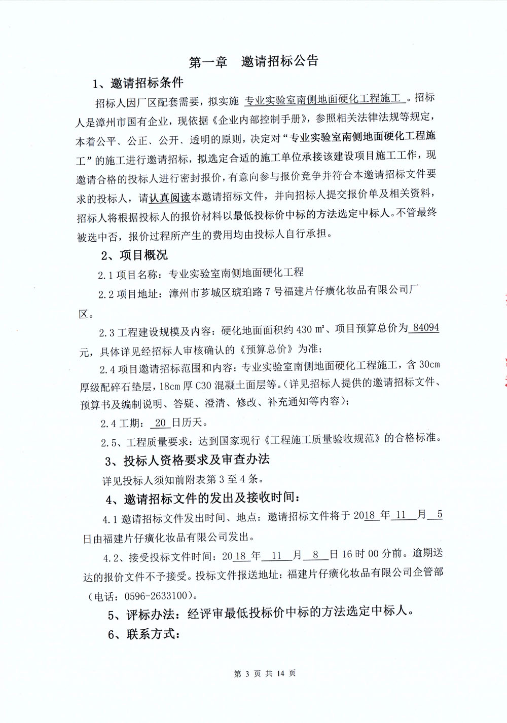 福建片仔癀化妆品有限公司专业实验室南侧地面硬化工程施工邀请招标文件