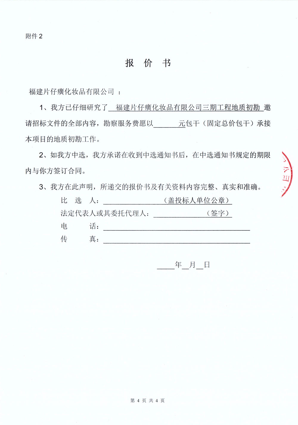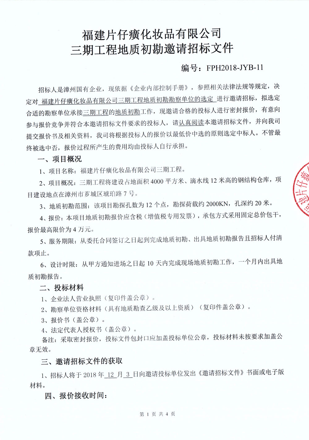 福建片仔癀化妆品有限公司三期工程地质初勘邀请招标文件
