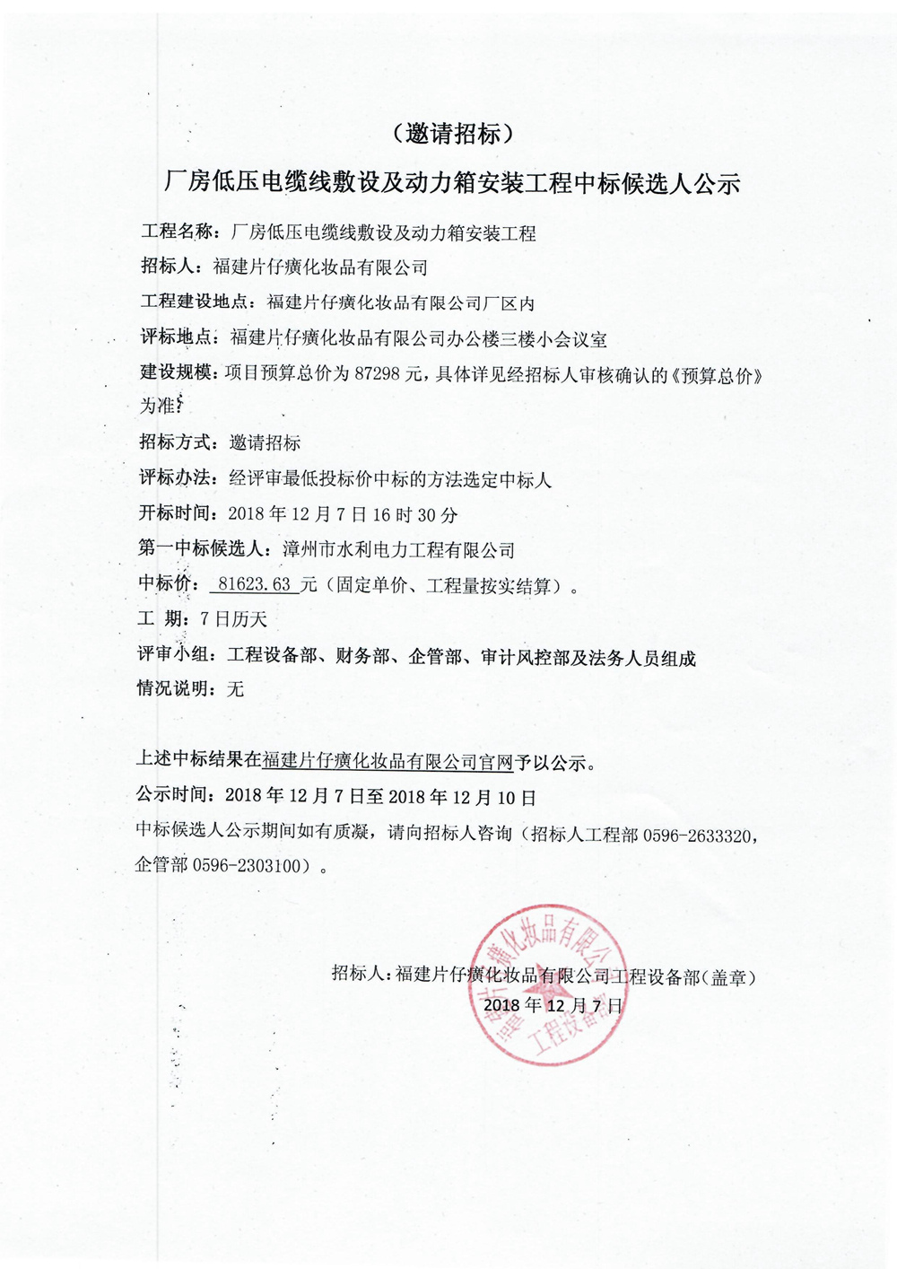 福建片仔癀化妆品有限公司厂房低压电缆线敷设及动力箱安装工程中标候选人公示