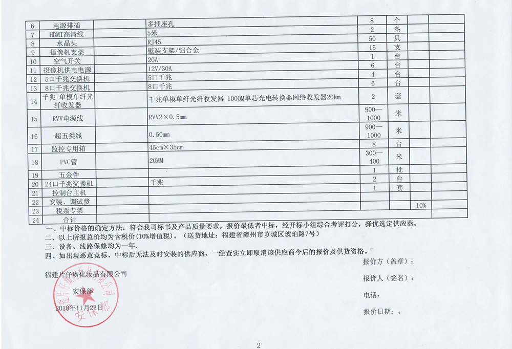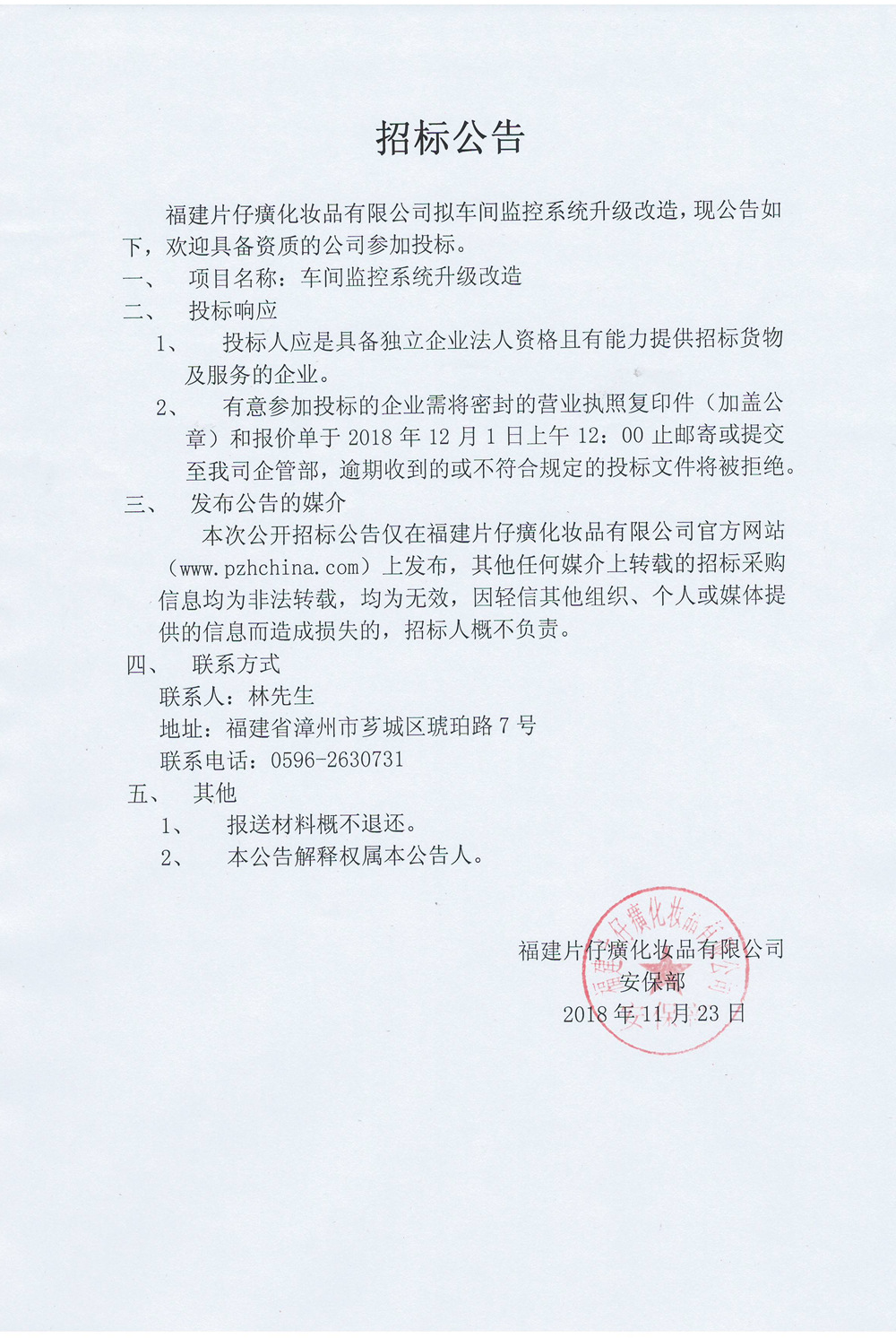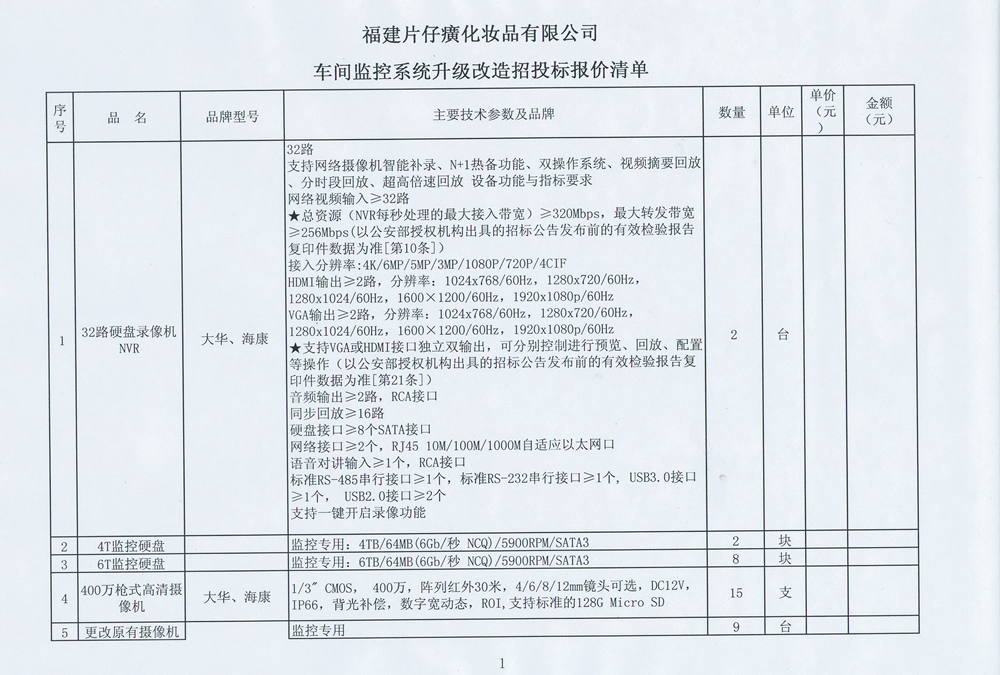 福建片仔癀化妆品有限公司车间监控系统升级改造招标公告