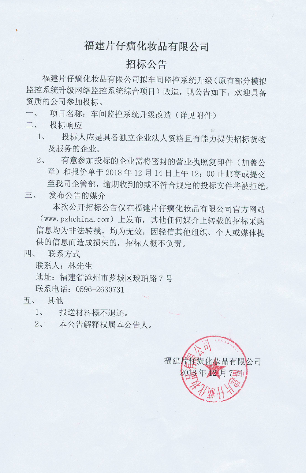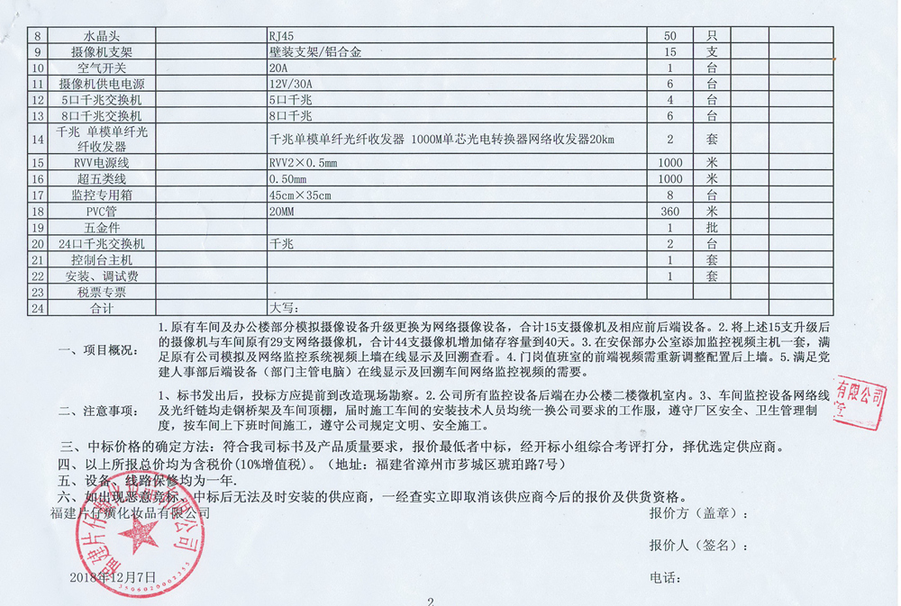 福建片仔癀化妆品有限公司车间监控系统升级(原有部分模拟监控系统升级网络监控系统综合项目)改造招标公告