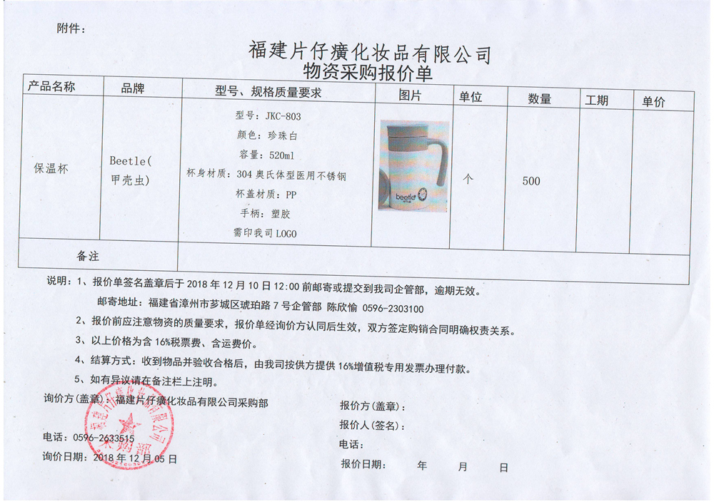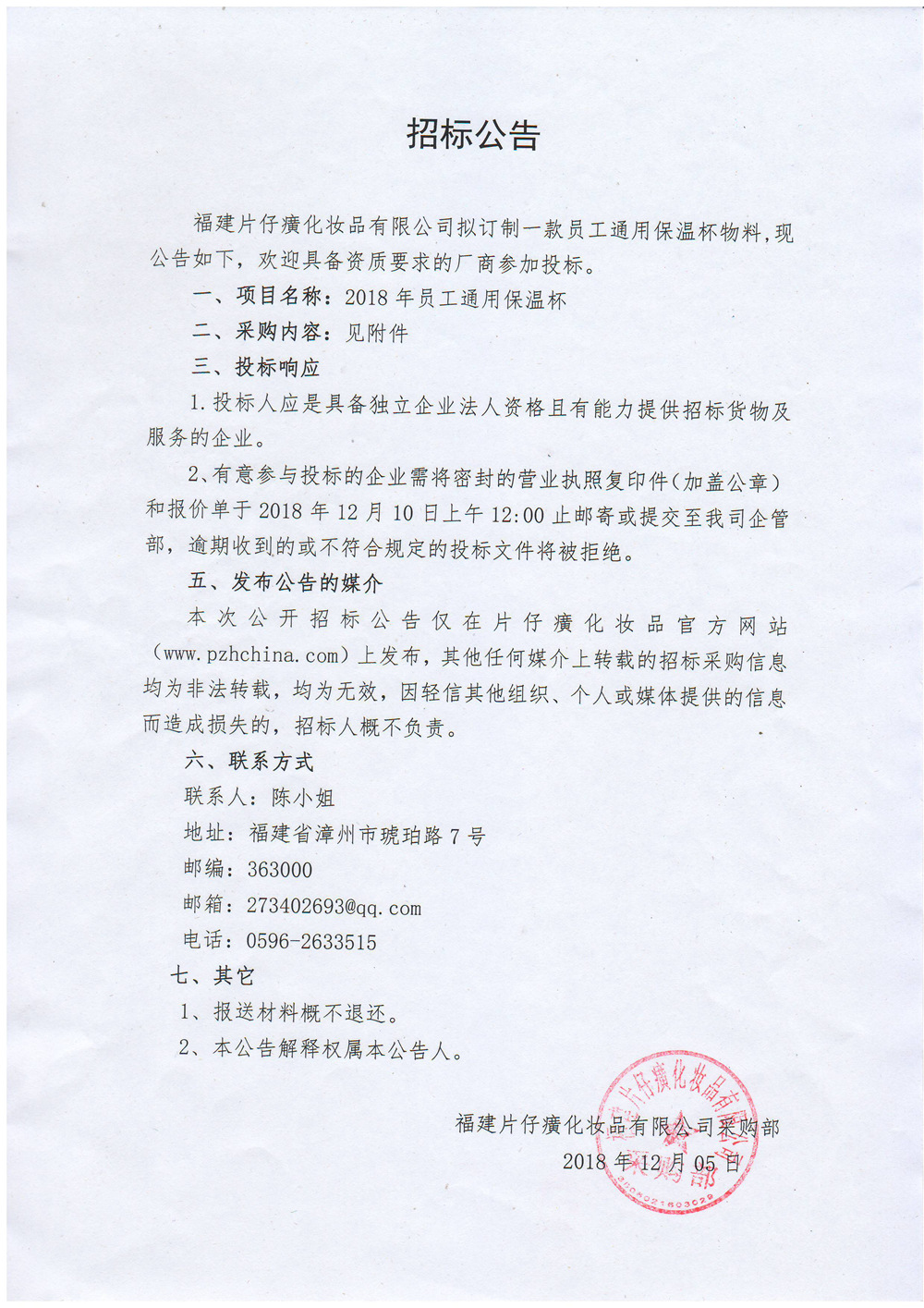 福建片仔癀化妆品有限公司2018年员工通用保温杯招标公告