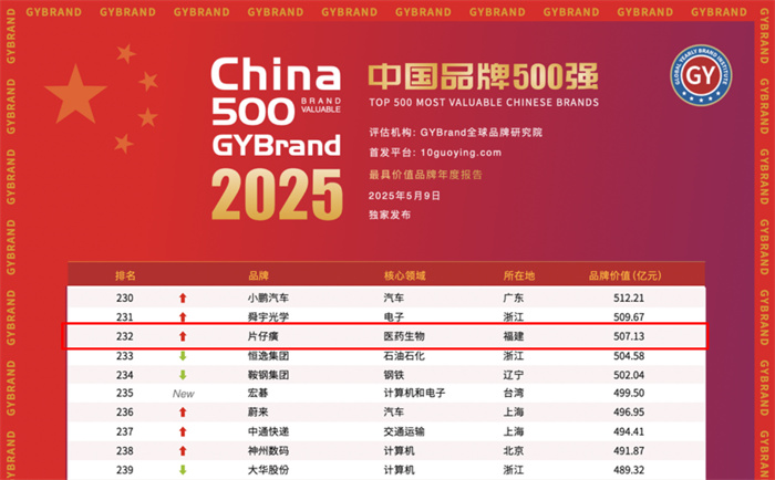 片仔癀品牌入选2025年GYBrand全球品牌“中国最具价值品牌500强”第232位