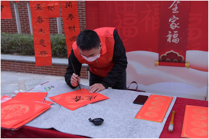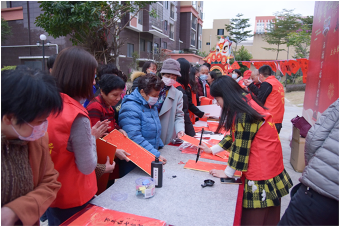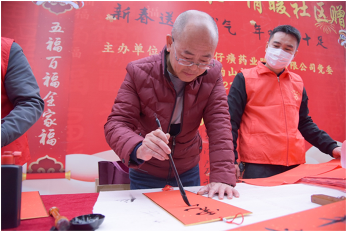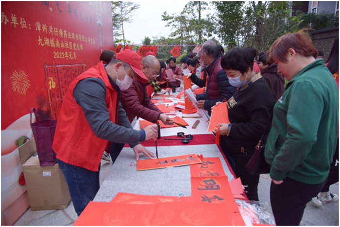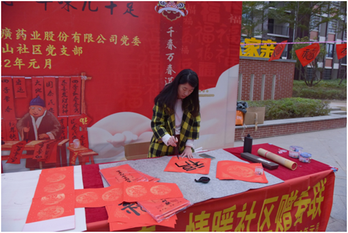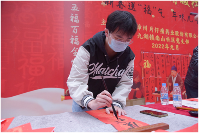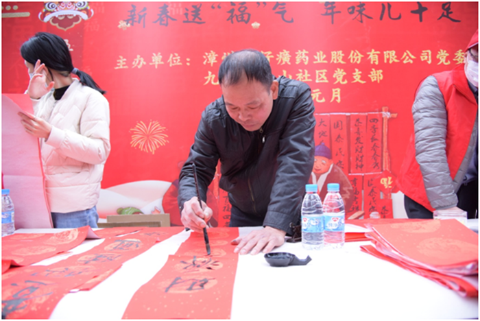 写春联、贴福字、贴窗花是中华民族欢度春节的传统习俗,象征着吉祥如意,更表达了人们对来年事事顺遂的美好愿景。为进一步弘扬中华优秀传统文化,营造欢乐祥和的节日氛围,弘扬向上向善的道德风尚,2022年1月18日上午,片仔癀公司党委以近邻党建为引领,携手九湖镇南山社区党支部在南星小区举办“墨香四溢迎新春 情暖社区赠春联”活动,邀请公司职工、职工子女及社区书法爱好者现场写春联,为即将到来的2022年春节增添年味。