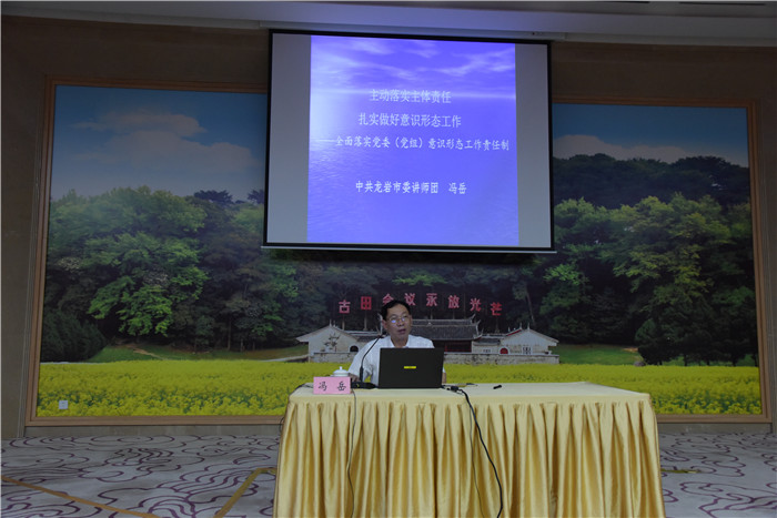 原龙岩市委讲师团团长冯岳讲授《主动落实主体责任,扎实做好意识形态工作——全面落实党委(党组)意识形态工作责任制》,从主动落实主体责任,在科学应对挑战中扎实做好意识形态工作等方面进行剖析讲解。