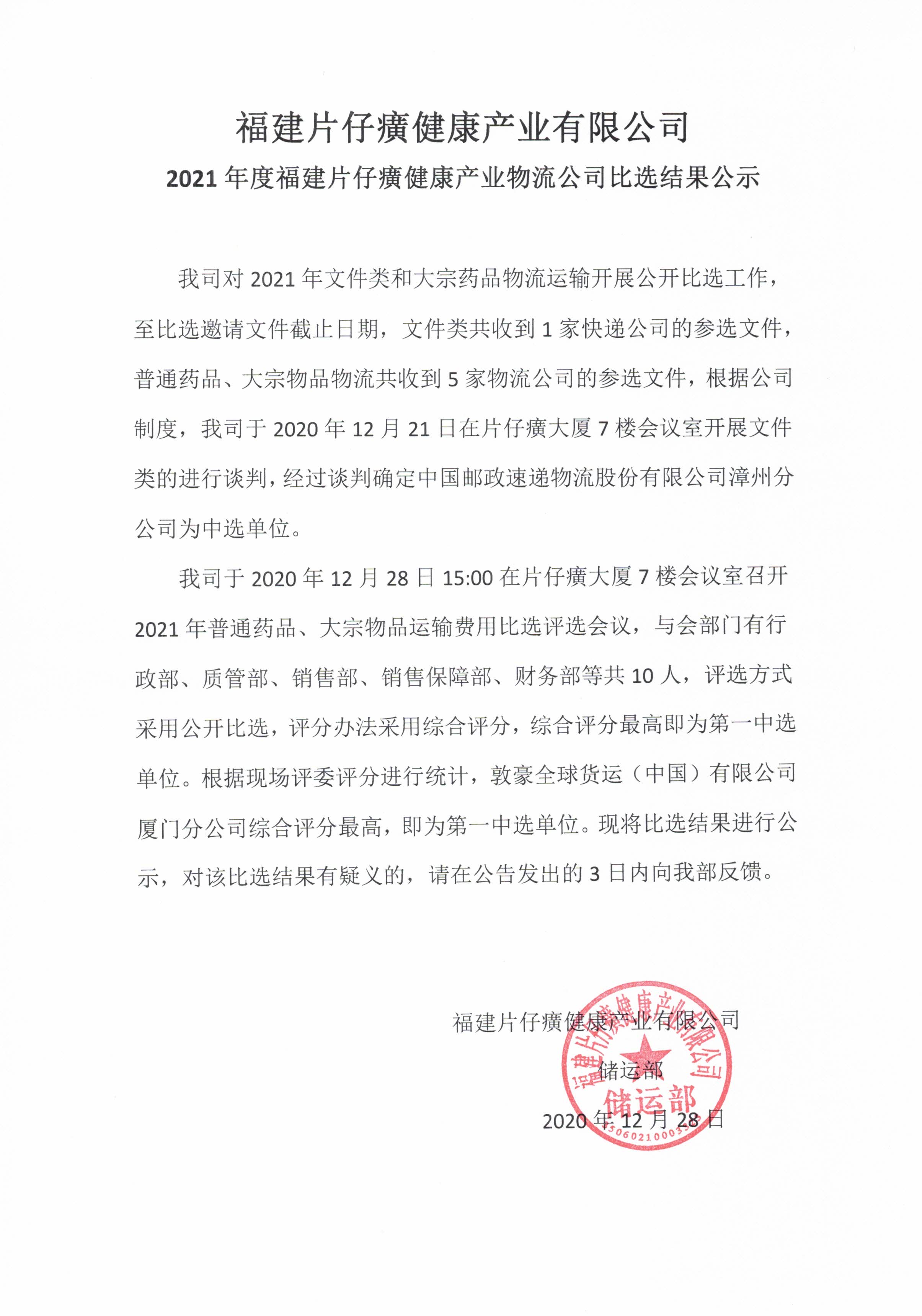 福建片仔癀健康产业有限公司2021年度物流公司比选结果公示