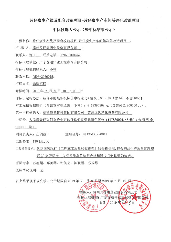 片仔癀生产线及配套改造项目-片仔癀生产车间等净化改造项目中标候选人公示